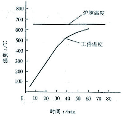 由于該工件厚度較厚,體積較大,采用硬加熱規(guī)范,把爐膛溫度預(yù)置到650℃,然后把安置好釬料和釬劑的工件放入爐膛進行加熱,待工件溫度上升到600℃即可出爐冷卻。圖3為爐膛和工件溫度與時間的變化曲線。2.3 焊后清洗 釬焊后的工件在20%左右的硝酸溶液中清洗,可以得到滿意的清洗效果。